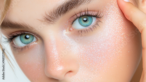 Fototapeta premium Woman with blue eyes showing glitter makeup beauty portrait