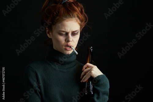 Obraz premium woman with bottle of alcohol bruises under eyes changes depression dark background