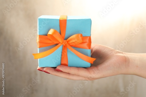 Fototapeta premium Woman with bright gift box against blurred grey background, closeup