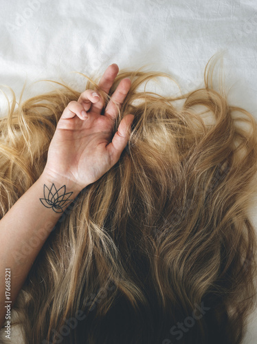 © Rawpixel.com, Obraz premium Woman with Brunette Hair Lying Down on the Bed