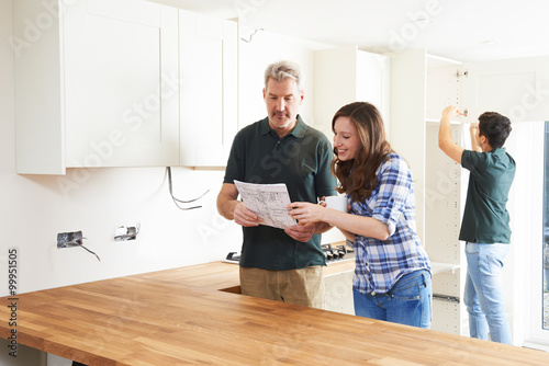 Fototapeta premium Woman With Carpenter Looking At Plans For New Kitchen