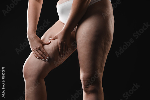 © New Africa, Naklejka premium Woman with cellulite on black background, closeup