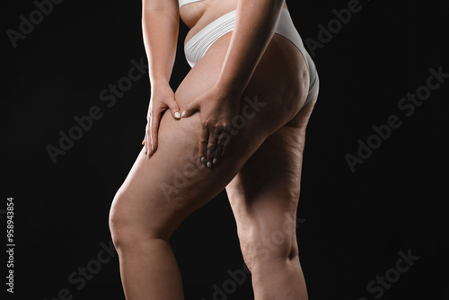 © New Africa, Naklejka premium Woman with cellulite on black background, closeup