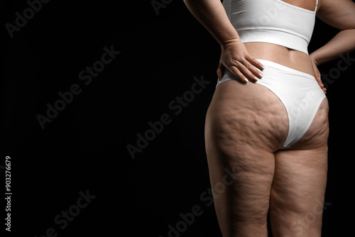 © New Africa, Fototapeta premium Woman with cellulite on black background, closeup. Space for text