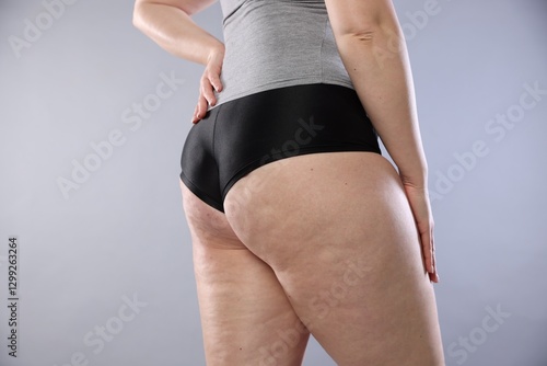 © New Africa, Fototapeta premium Woman with cellulite on light grey background, closeup