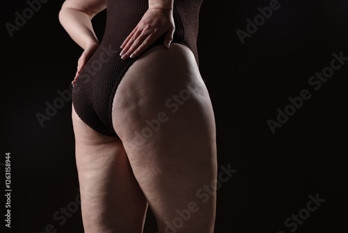 © New Africa, Naklejka premium Woman with cellulite problem on black background, closeup. Space for text