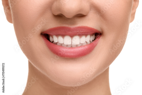Obraz premium Woman with clean teeth smiling on white background, closeup