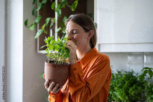 Fototapeta premium Woman with closed eyes enjoying smelling green mint plant on kitchen at home. Gardener amateur plant lover growing fresh herbs. House planting, gardening eco ecology products ingredients for cuisine.
