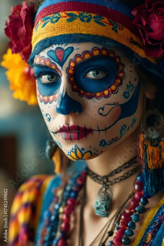 Fototapeta premium Woman with colorful calavera makeup celebrating day of the dead