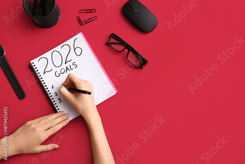 © Pixel-Shot, Naklejka premium Woman with computer mouse writing goals on 2026 against red background