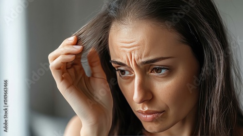 © Nuttaya Nampai, Obraz premium Woman with Concerned Expression Touching Hair in Soft Natural Light