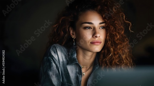 © Thares2020, Fototapeta premium Woman with curly hair intently focused on laptop display
