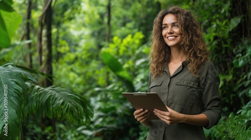 © angel_nt, Fototapeta premium woman with curly hair stands amidst vibrant foliage in a rainforest, smiling as she takes notes on her clipboard. sun filters through the dense canopy, illuminating her focus