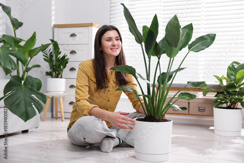 © New Africa, Naklejka premium Woman with different potted houseplants on floor at home