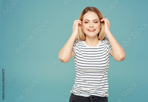 Fototapeta premium woman with displeased facial expression angry look blue background