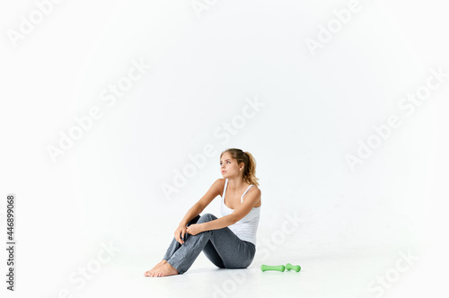 Fototapeta premium woman with dumbbells sitting on the floor exercise motivation workout