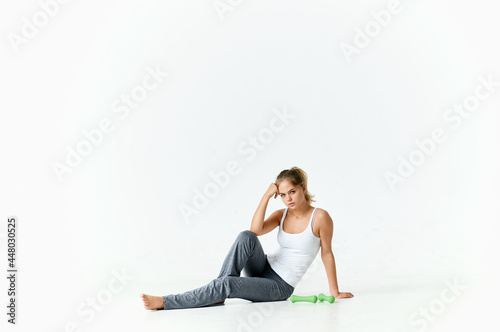 Obraz premium woman with dumbbells sitting on the floor exercise motivation workout