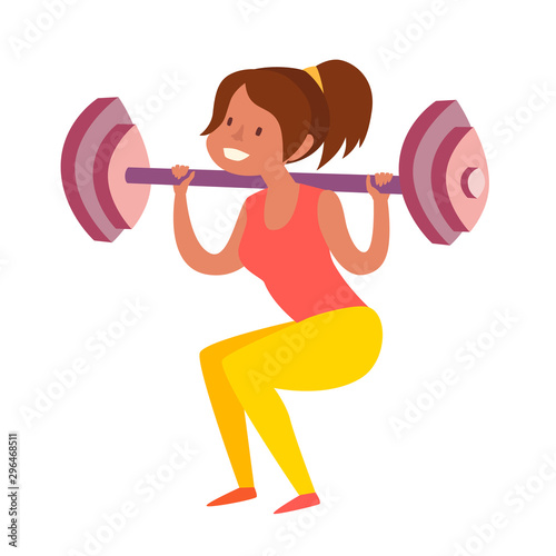 © coffeee_in, Obraz premium Woman with dumbbells squats. Weight loss healthy lifestyle concept. Isolated vector illustration on white background