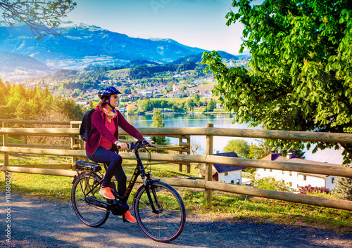 © Patrizia Tilly, Obraz premium woman with e-bike cycling beside a beautiful lake-lake and bike