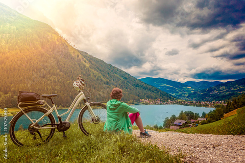 Fototapeta premium woman with e-bike resting above a lake/e-power 28