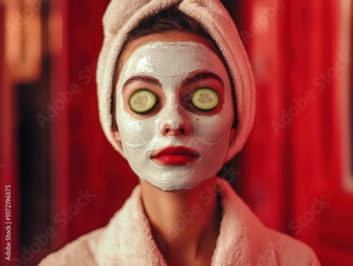 © Riya, Fototapeta premium woman with facial mask and cucumber slices on eyes