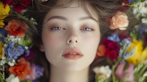 Fototapeta premium Woman with Flowers Surrounding Her Face