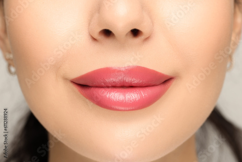 © New Africa, Fototapeta premium Woman with glossy lipstick on light background, closeup
