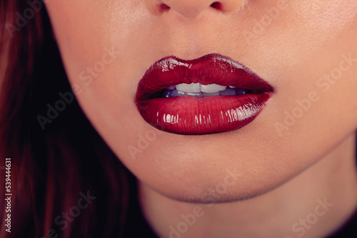 Fototapeta premium woman with glossy red lipstick close up