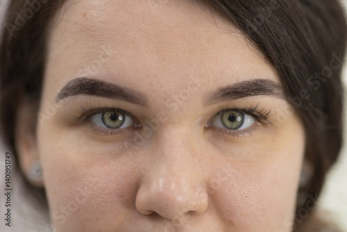 Fototapeta premium woman with green eyes and a dark eyebrow. The woman has a light brown eyebrow