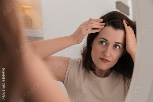 © New Africa, Naklejka premium Woman with hair loss problem at home