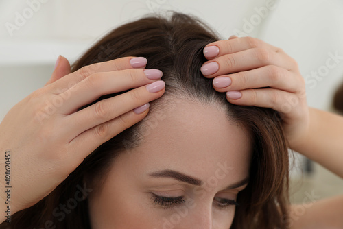 Fototapeta premium Woman with hair loss problem at home, closeup
