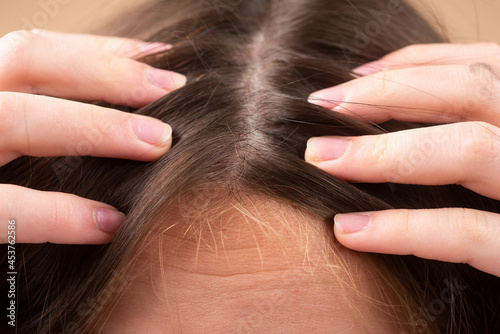 Naklejka premium Woman with hair loss problem. Portrait of Young girl with a bald. Head shot...