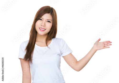 © leungchopan, Fototapeta premium Woman with hand showing a blank sign for product selling