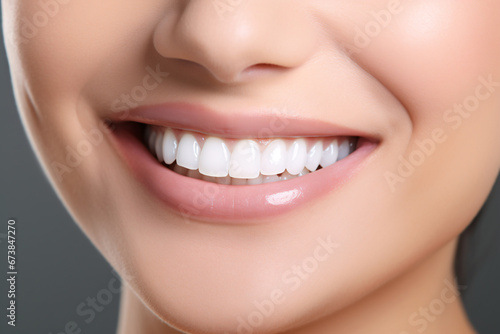 Fototapeta premium Woman with happy smile and beautiful white teeth, close up shot, oral and...