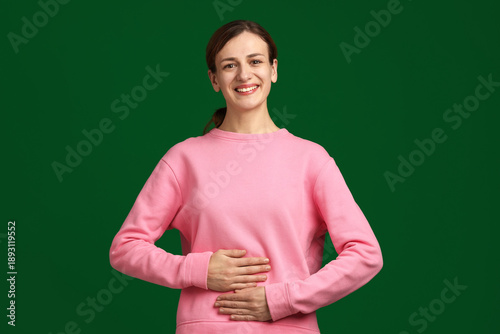 © New Africa, Fototapeta premium Woman with healthy stomach on green background