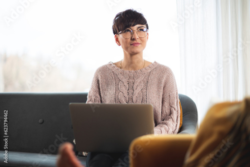 © leszekglasner, Naklejka premium Woman with laptop at home focus and planning