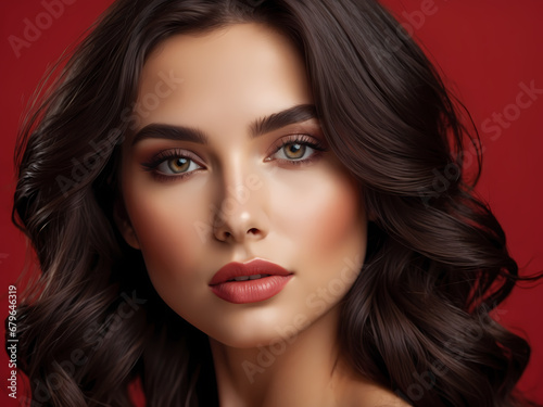 © wasan, Fototapeta premium woman with long bown curly hair. Portrait of a Beautiful Brunette sexy girl with long hair