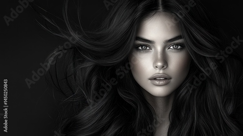 Fototapeta premium Woman with long dark hair and light skin against a dark background.