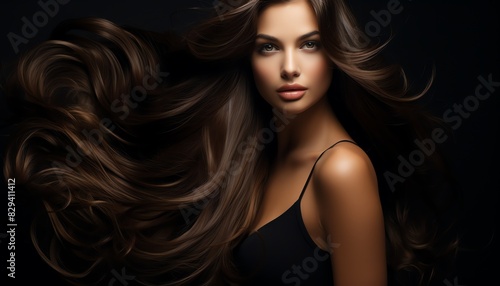 Obraz premium Woman with long, flowing brown hair, sleek and shiny, dark background