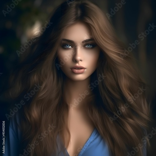© Gerges, Fototapeta premium Woman with long, flowing hair gazes directly at the camera in a dimly lit, natural setting with soft background elements