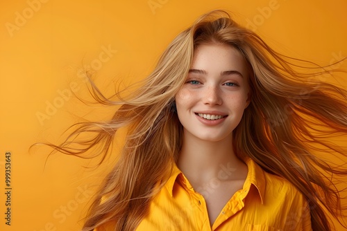 © Faustudio, Fototapeta premium Woman with long hair smiling in yellow shirt.