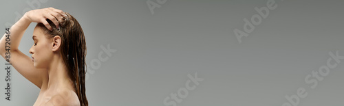 © LIGHTFIELD STUDIOS, Fototapeta premium Woman with long hair stands gracefully washing hair.