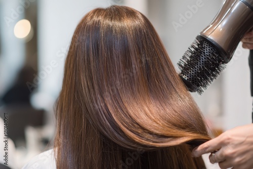 © Marina Demidiuk, Fototapeta premium Woman with long, shiny, straight brown hair is sitting in the salon chair while her professional stylist dries it with a blow-dryer. Beautiful hairstyle. Close-up of hair styled with an electric dryer