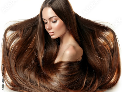 © hakule, Obraz premium Woman With Long, Straight Brown Hair Against White Background