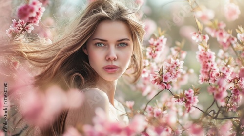 Fototapeta premium woman with loose locks, posing among cherry blossoms in a spring garden...
