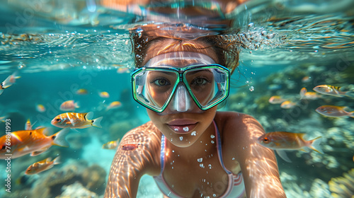 © JMarques, Naklejka premium Woman with mask or goggles snorkeling underwater on a beach or sea with clear water, turquoise water, tropical fish, scuba diving.