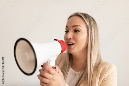© makyzz, Naklejka premium Woman with megaphone. Business woman with loudspeaker. Digital marketing concept