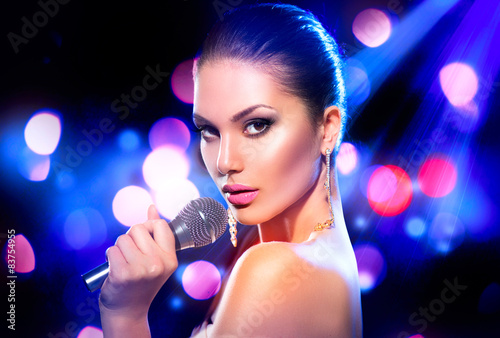 © Subbotina Anna, Fototapeta premium Woman with microphone over blinking bokeh night background