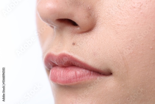 Obraz premium Woman with mole on her face against white background, closeup