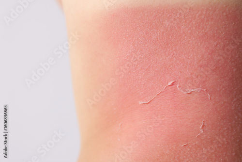 © New Africa, Fototapeta premium Woman with peeling skin from sunburn on light background, closeup
